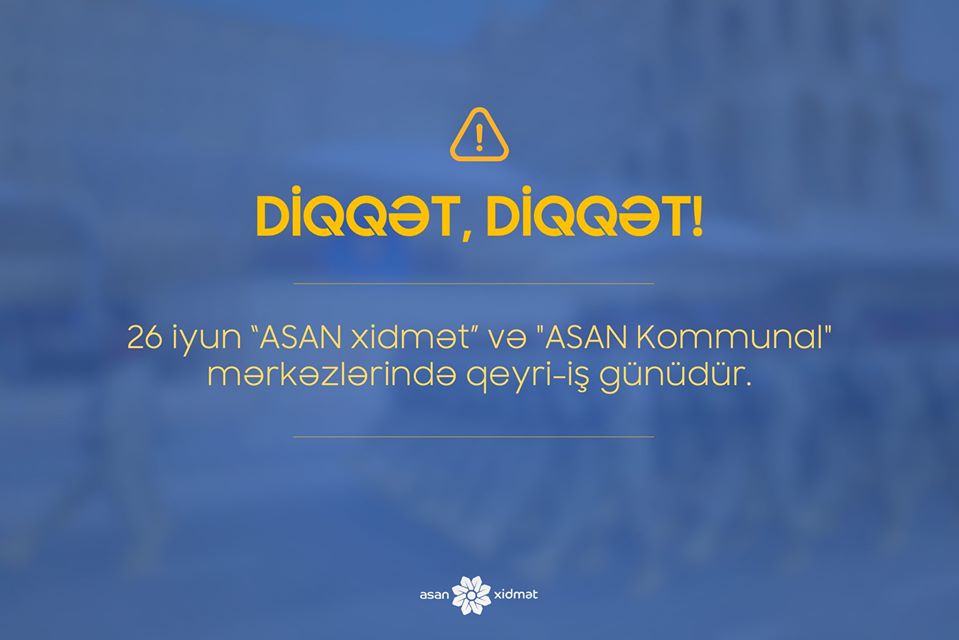 26 iyun - Azərbaycan Respublikasının Silahlı Qüvvələri günü ilə əlaqədar “ASAN xidmət” və "ASAN Kommunal" mərkəzlərində qeyri-iş günüdür.