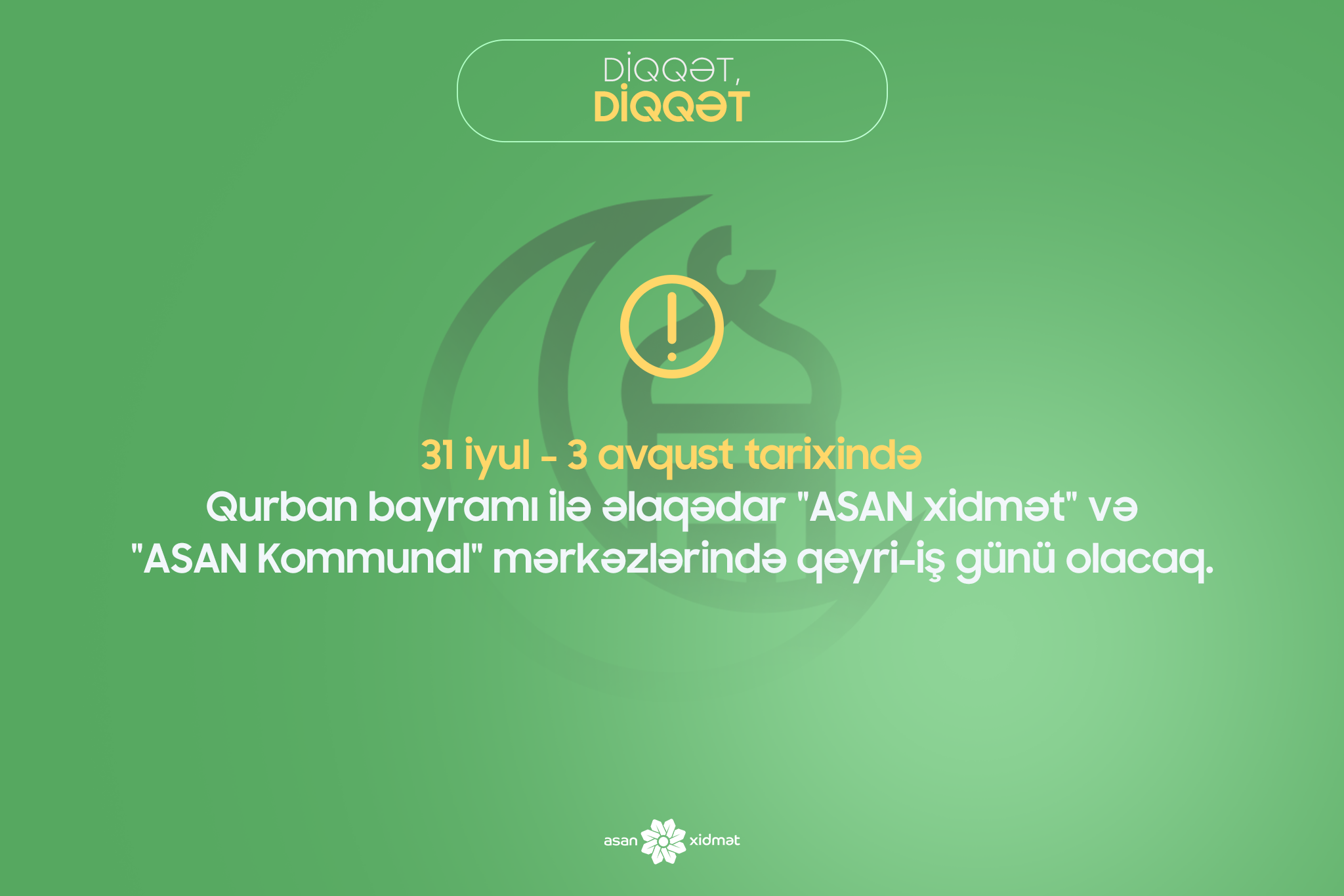 31 iyul - 3 avqust tarixində Qurban bayramı ilə əlaqədar "ASAN xidmət" və "ASAN Kommunal" mərkəzlərində qeyri-iş günü olacaq.