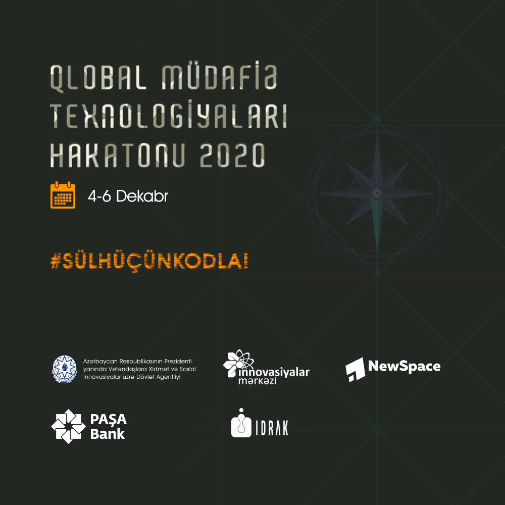 4-6 dekabr 2020-ci il tarixində Azərbaycan Respublikasının Prezidenti yanında Vətəndaşlara Xidmət və Sosial İnnovasiyalar üzrə Dövlət Agentliyinin tabeliyində olan "İnnovasiyalar Mərkəzi" və "NewSpace" şirkətinin təşkilatçılığı ilə “Qlobal Müdafiə Texnologiyaları Hakatonu” beynəlxalq tədbiri keçiriləcək.