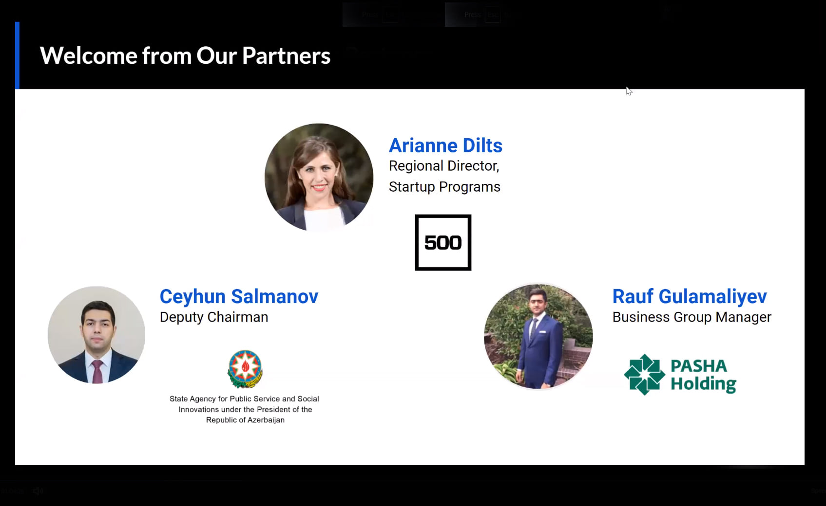 Görüşdə Azərbaycan Respublikasının Prezidenti yanında Vətəndaşlara Xidmət və Sosial İnnovasiyalar üzrə Dövlət Agentliyi sədrinin müavini Ceyhun Salmanov, “PAŞA Holdinq”in Biznes qrupunun meneceri Rauf Qulaməliyev, “500 Startups” şirkətinin regional direktoru Arianne Dilts və həmin şirkətin digər əməkdaşları iştirak ediblər.