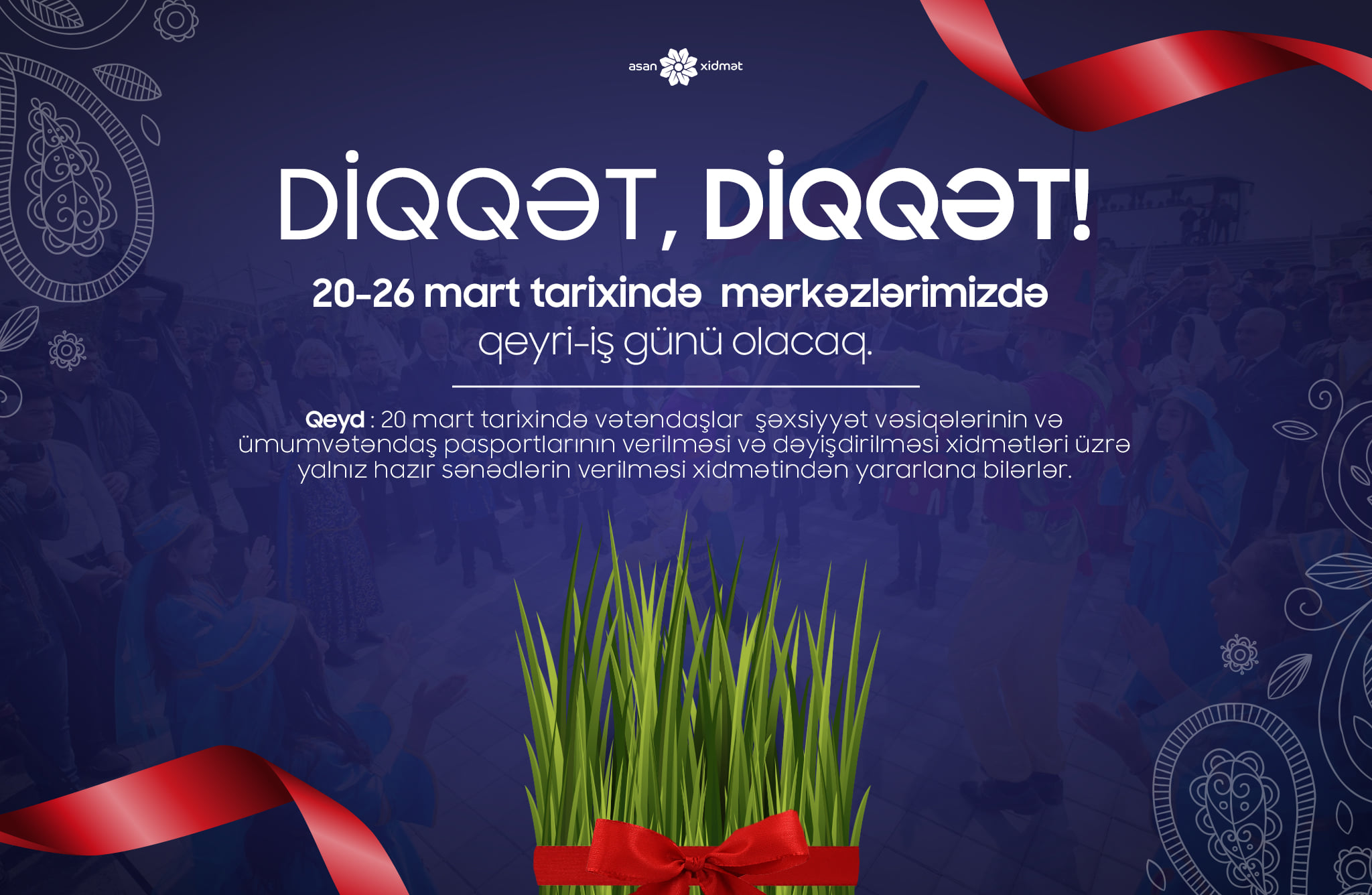 Novruz bayramı ilə əlaqədar 20-26 mart tarixində “ASAN xidmət” və “ASAN kommunal” mərkəzlərində qeyri-iş günü olacaq.