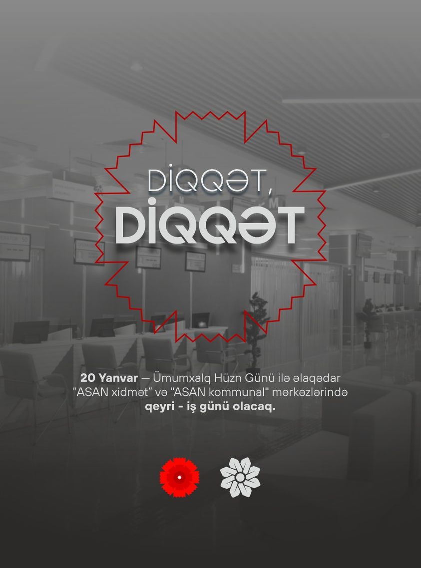 20 Yanvar - Ümumxalq Hüzn Günü ilə əlaqədar “ASAN xidmət” və "ASAN kommunal" mərkəzlərində qeyri - iş günü olacaq.