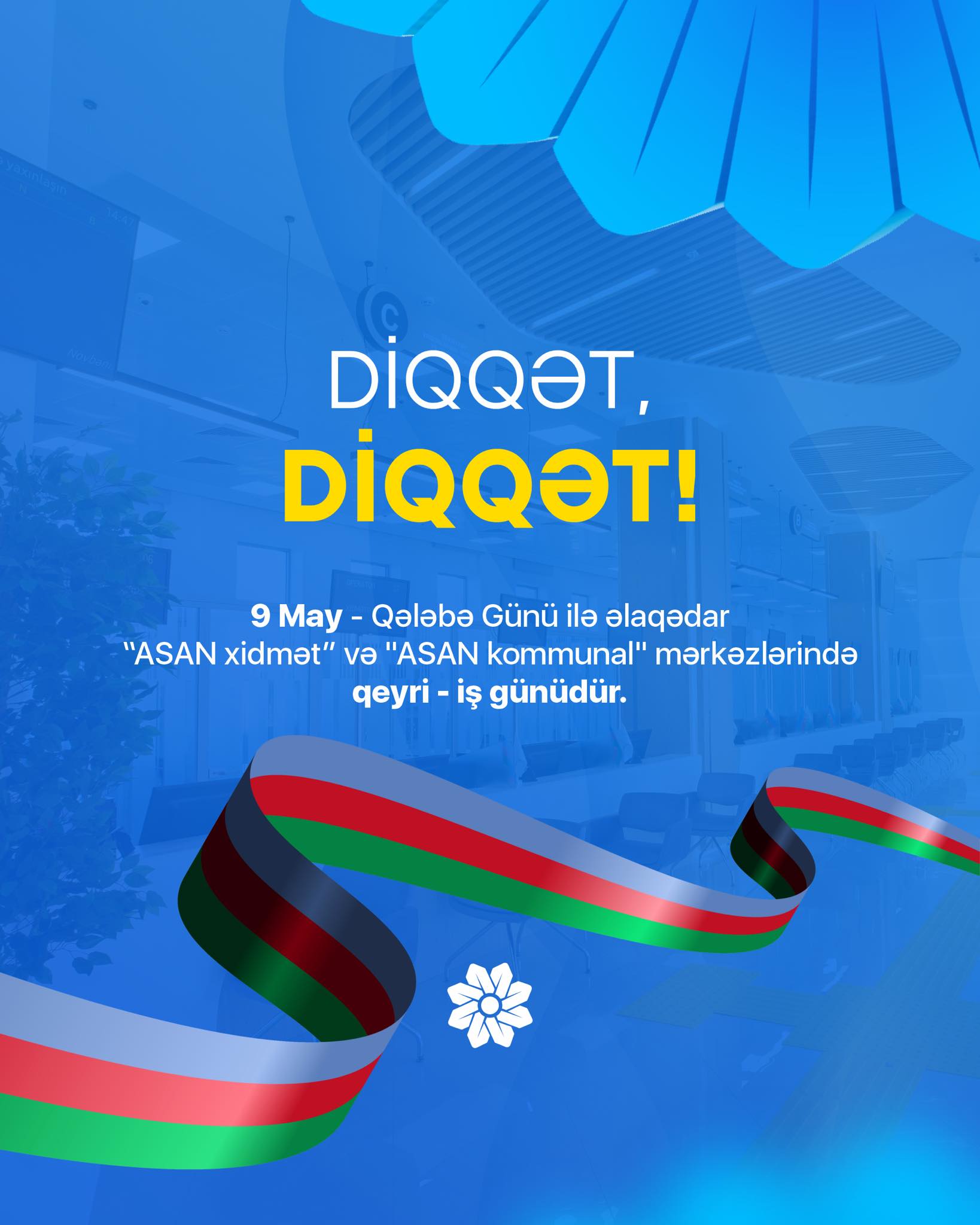 9 May - Qələbə Günü ilə əlaqədar “ASAN xidmət” və "ASAN kommunal" mərkəzlərində qeyri - iş günü olacaq.