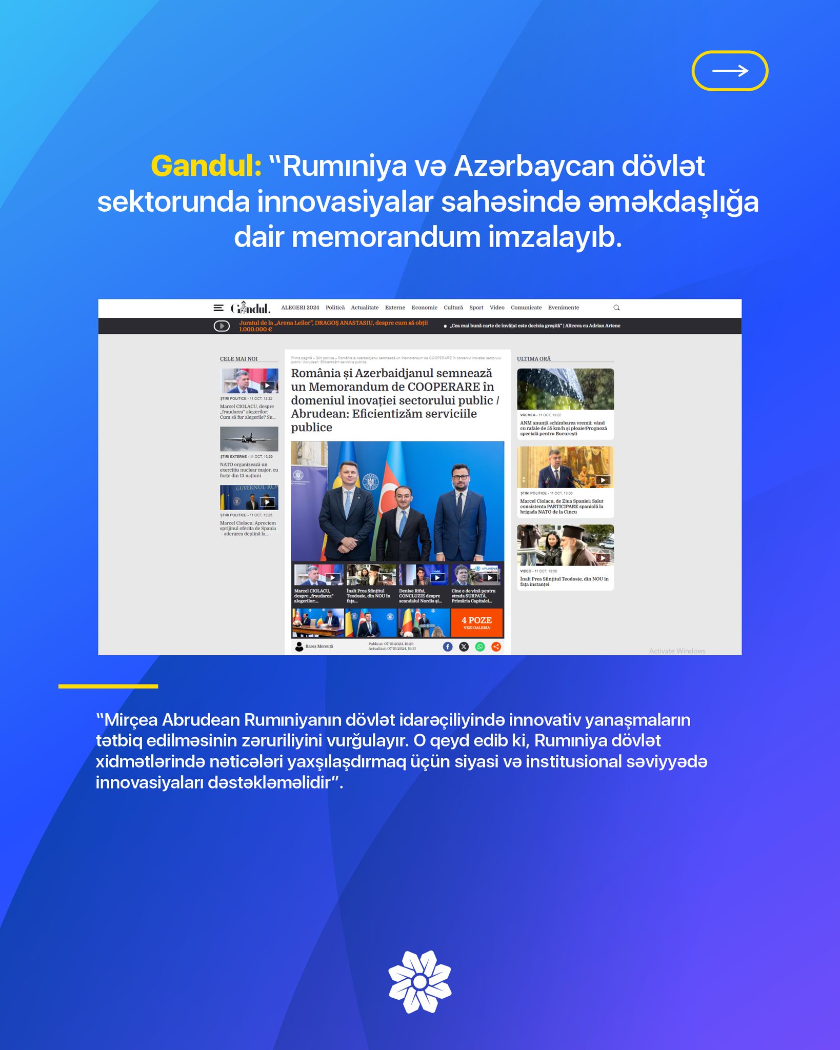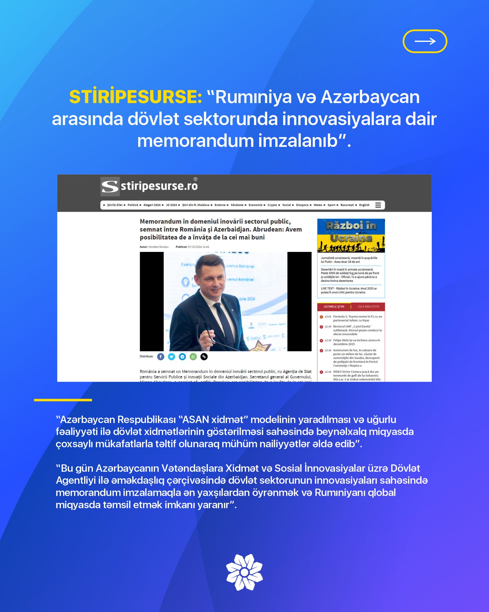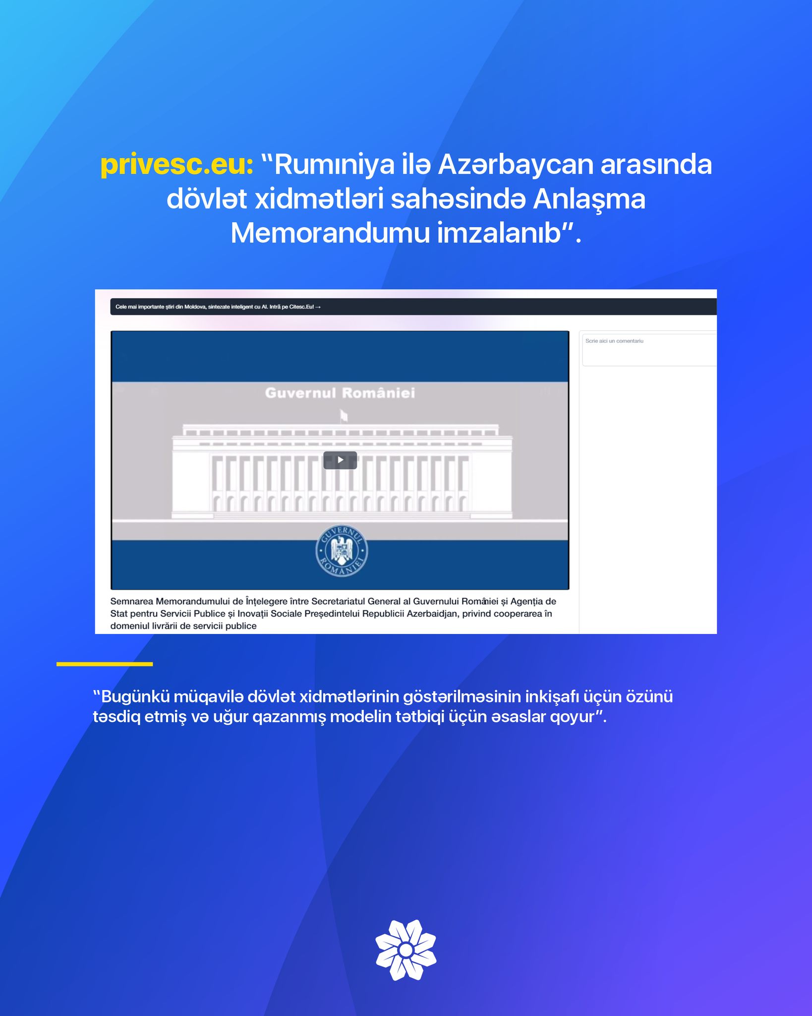 Azərbaycan Respublikasının Prezidenti yanında Vətəndaşlara Xidmət və Sosial İnnovasiyalar üzrə Dövlət Agentliyi ilə Rumıniya Hökumətinin Baş Katibliyi arasında imzalanmış Anlaşma Memorandumuna dair bu ölkənin bır sıra mətbu orqanlarında məqalələr dərc olunub.