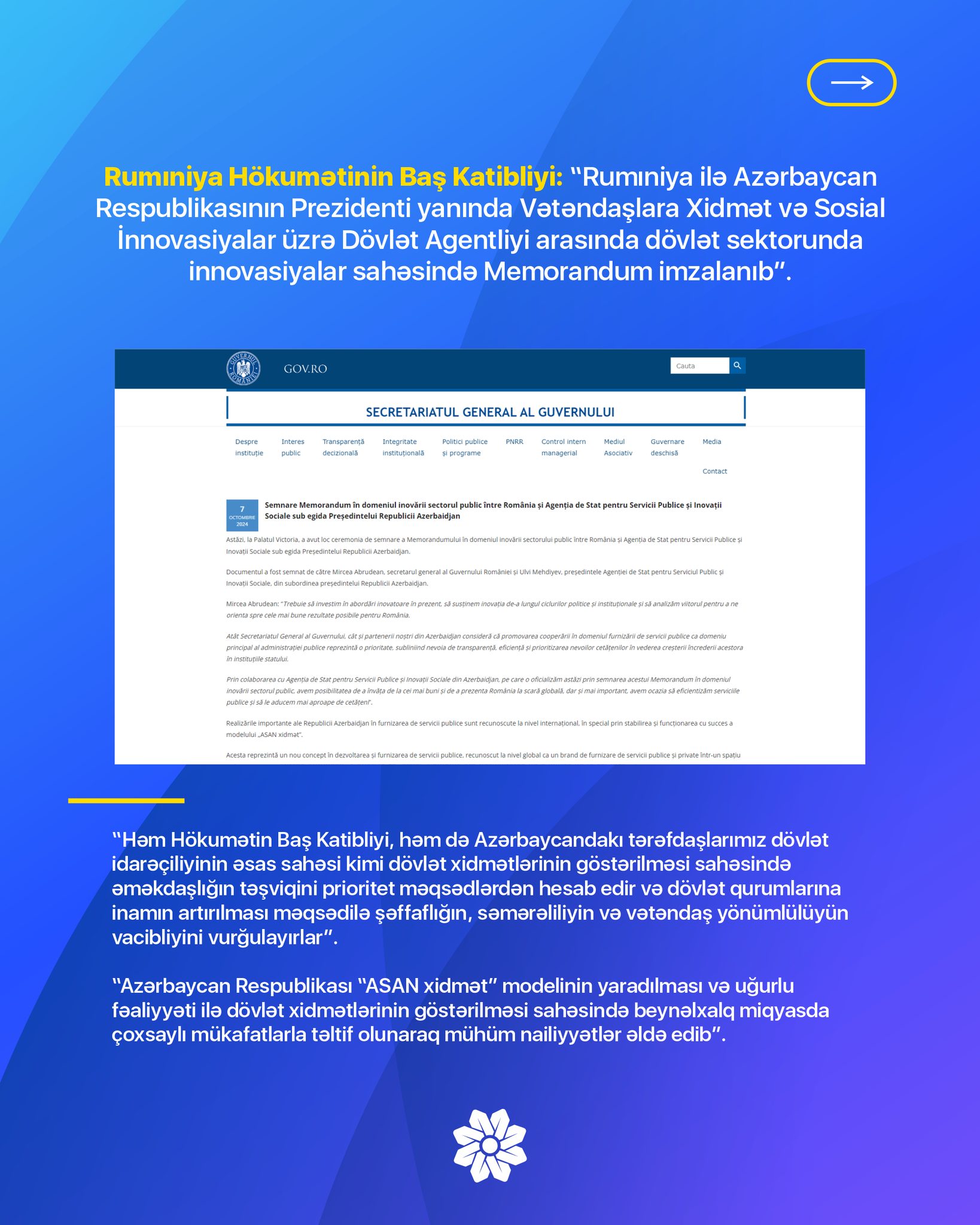 Vurğulanıb ki, müvafiq Memorandum Azərbaycanın "ASAN xidmət" təcrübəsi əsasında Rumıniyada dövlət xidmətlərinin göstərilməsinin təkmilləşdirilməsinə və müvafiq sahədə sosial innovasiyaların tətbiqinə imkan verəcək.