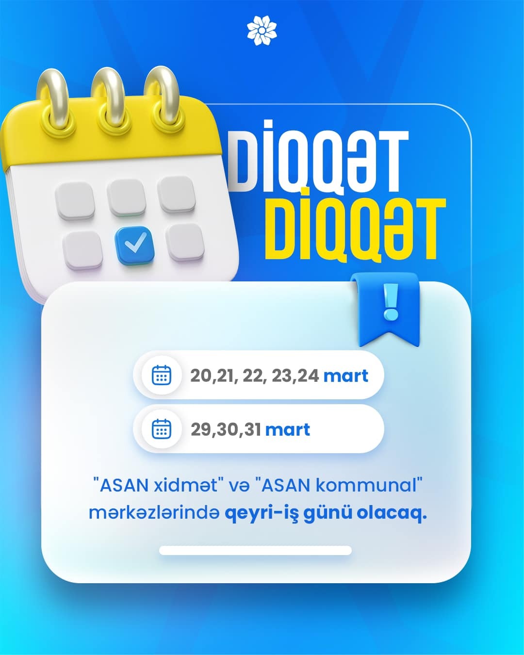 Novruz və Ramazan bayramları ilə əlaqədar 20, 21, 22, 23, 24 həmçinin 29, 30 və 31 mart tarixlərində "ASAN xidmət" və "ASAN kommunal" mərkəzlərində qeyri-iş günü olacaq.