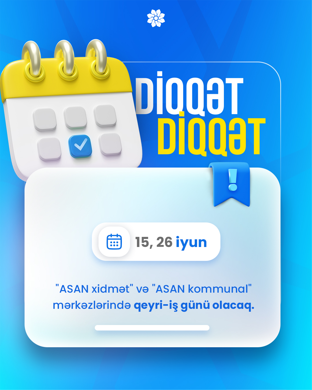 Milli Qurtuluş Günü ilə əlaqədar 15 iyun tarixində, Azərbaycan Respublikasının Silahlı Qüvvələri Günü ilə əlaqədar isə 26 iyun tarixində “ASAN xidmət” və “ASAN kommunal” mərkəzlərində qeyri-iş günü olacaq.