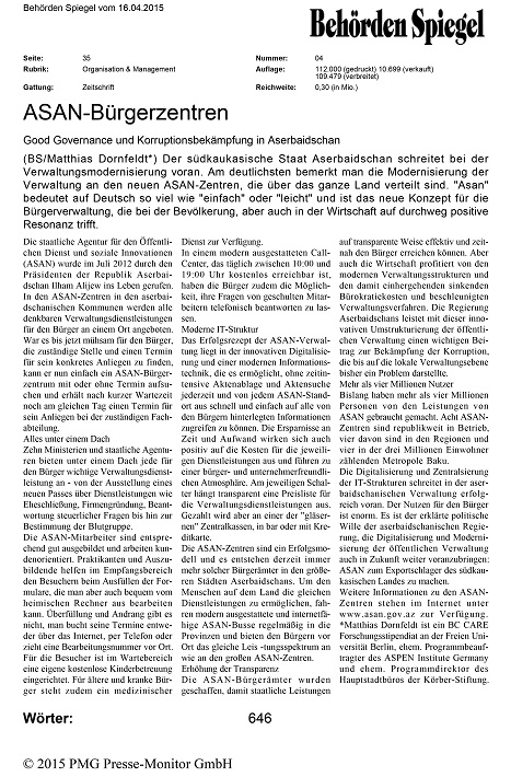 Almaniyanın nüfuzlu `Behörden Spiegel` qəzetinin 16 aprel tarixli sayında “ASAN xidmət“ haqqında məqalə dərc olunub. Məqalənin müəllifi Qafqaz və Xəzər regionunun araşdırılması üzrə Berlin Avropa İnstitutunun sədri Matias Dornfeltdir.