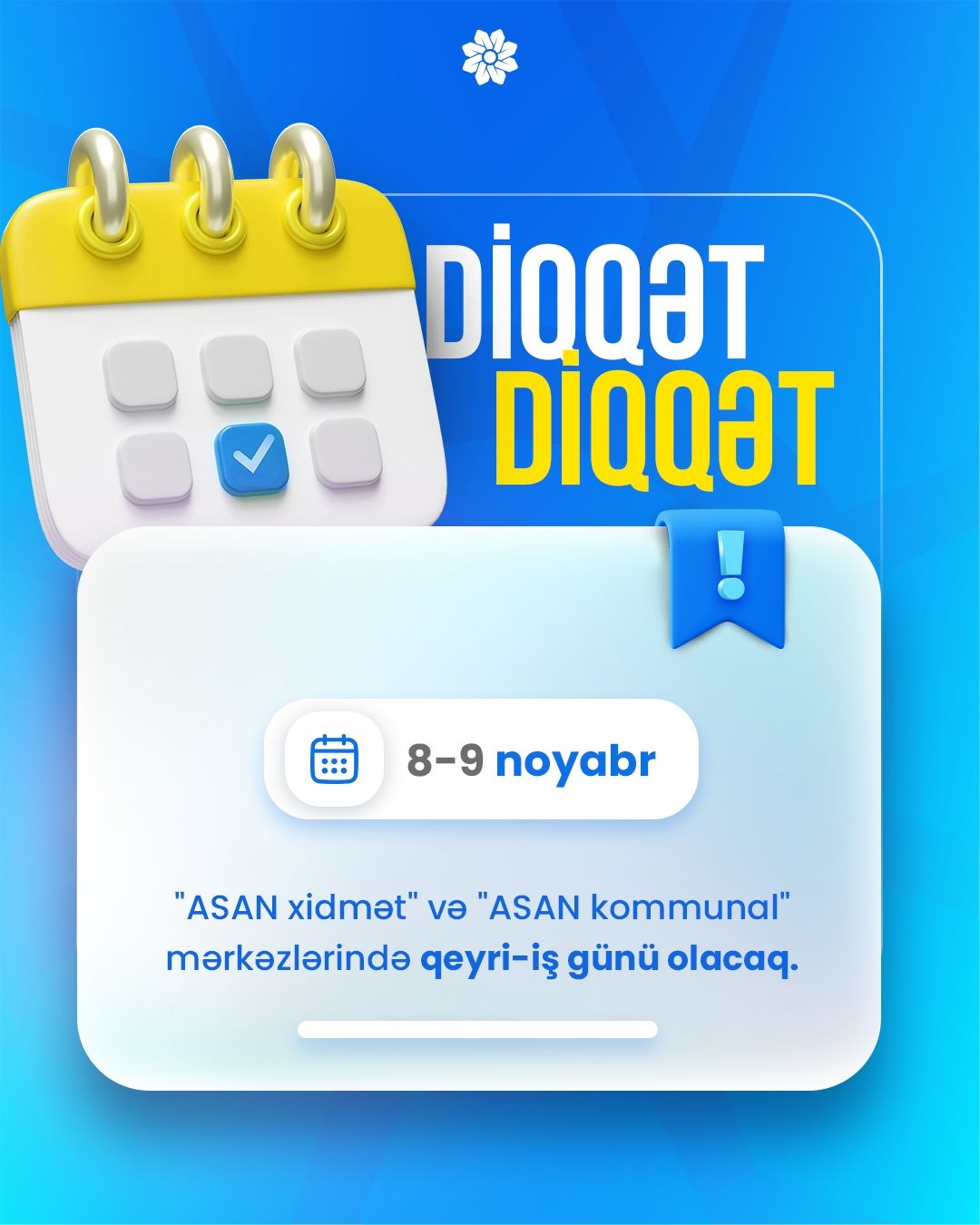 Zəfər Günü və Azərbaycan Respublikasının Dövlət Bayrağı Günü ilə əlaqədar 8 və 9 noyabr tarixlərində "ASAN xidmət" və "ASAN kommunal" mərkəzlərində qeyri-iş günü olacaq.