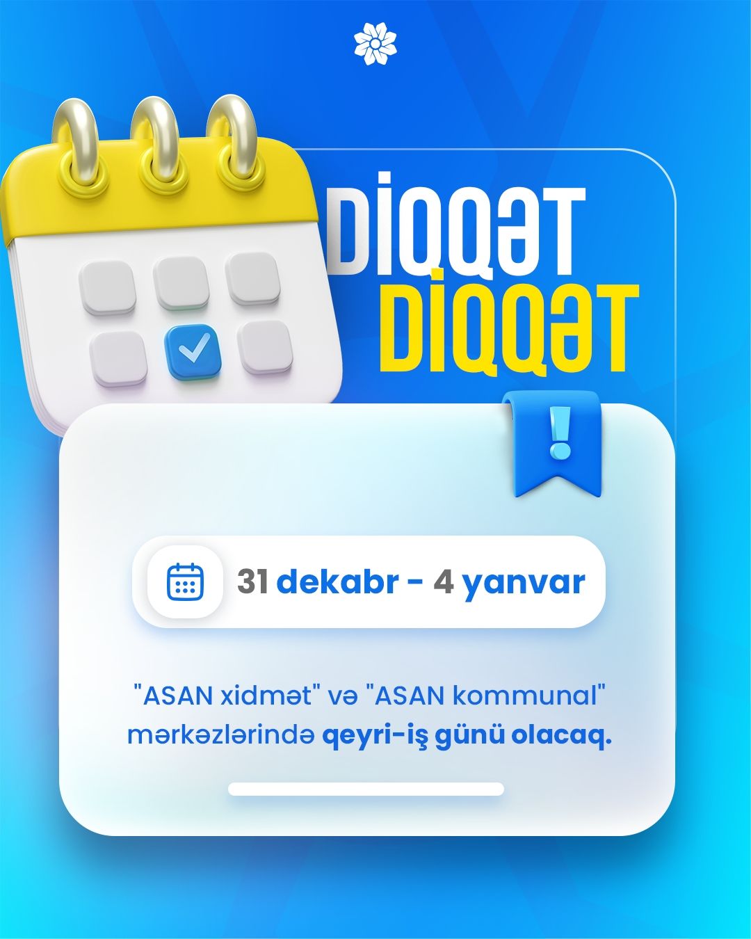 Dünya Azərbaycanlılarının Həmrəyliyi Günü və Yeni il bayramı ilə əlaqədar 31 dekabr – 4 yanvar tarixində “ASAN xidmət” və “ASAN kommunal” mərkəzlərində qeyri-iş günü olacaq.