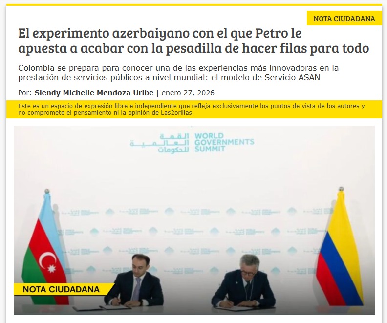 Kolumbiyanın aparıcı media platformalarından biri olan “Las2orillas” portalında dövlət xidmətləri sahəsində ölkəmizin uğurlu təcrübəsi kimi tanınan “ASAN xidmət” modeli haqqında geniş məqalə dərc olunub.