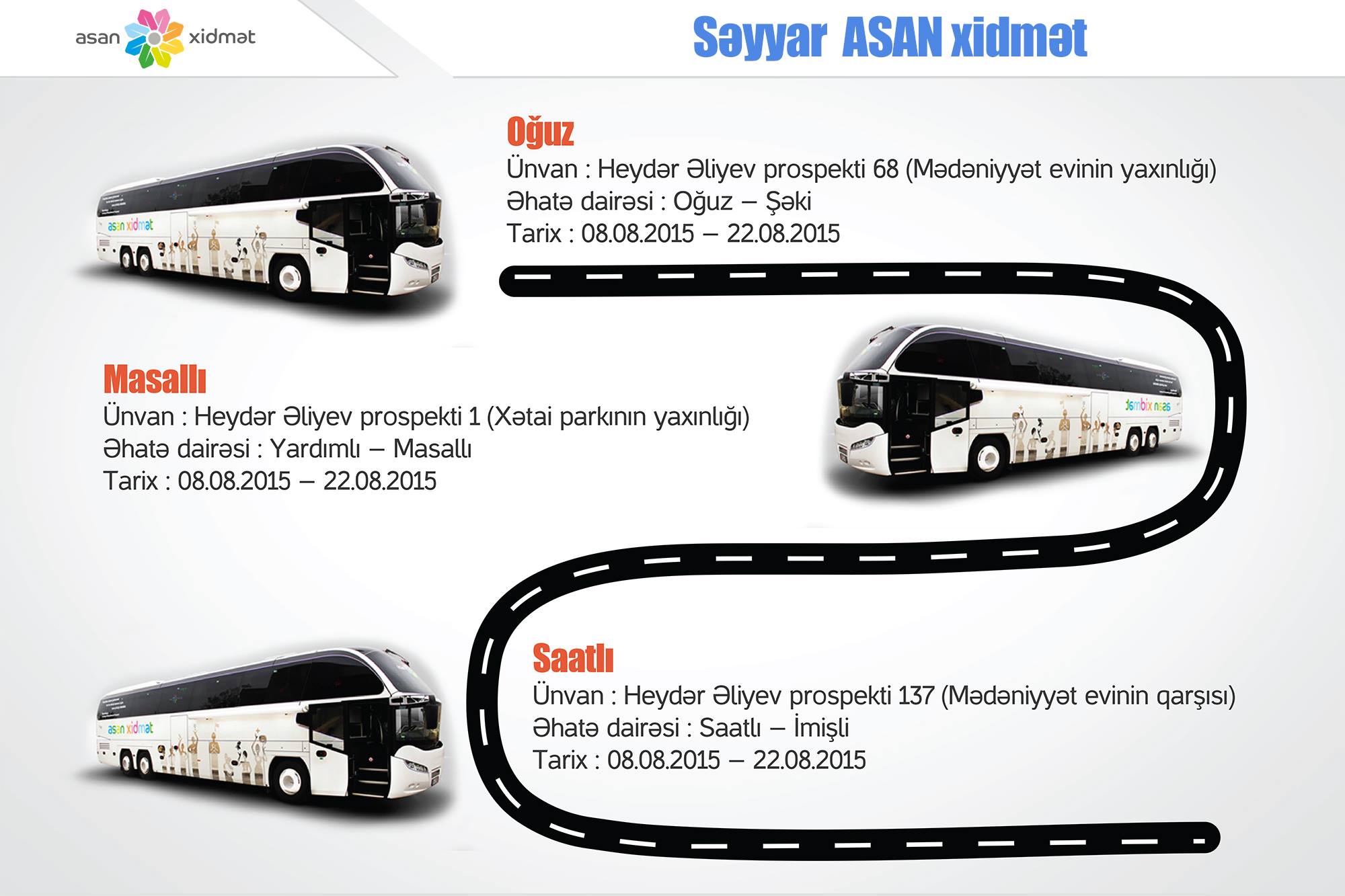 08 - 22 avqust tarixlərində Səyyar ASAN xidmət Oğuz rayonunda Oğuz və Şəki, Masallı şəhərində Masallı və Yardımlı, Saatlı rayonunda isə Saatlı və İmişli sakinlərinə səyyar formada xidmət göstərəcək.