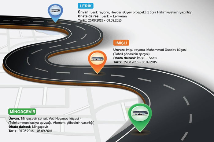 25 avqust - 08 sentyabr tarixlərində Səyyar ASAN xidmət Mingəçevir şəhərində Mingəçevir, Lerik rayonunda Lerik və Lənkəran, İmişli rayonunda isə İmişli və Saatlı sakinlərinə səyyar formada xidmət göstərəcək.