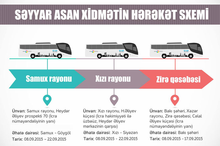 8 sentyabr 2015-ci il tarixindən etibarən Səyyar ASAN xidmət Samux və Xızı rayonlarında, həmçinin Bakı şəhərinin Xəzər rayonunun Zirə qəsəbəsində əhaliyə xidmətlər göstərəcək. Belə ki: