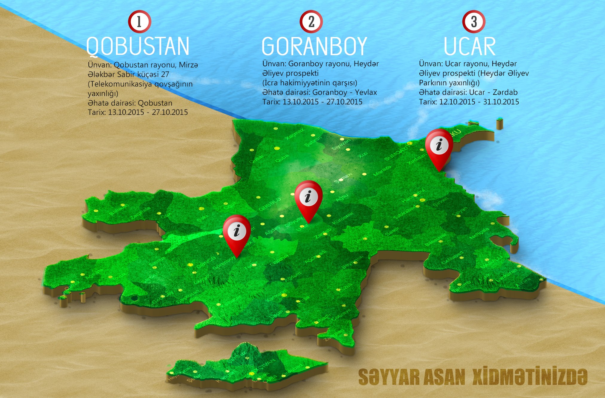 13– 27 oktyabr tarixində Səyyar ASAN xidmət Goranboy rayonunda Goranboy və Yevlax, Qobustan rayonunda isə Qobustan sakinlərinə səyyar formada xidmət göstərəcək.