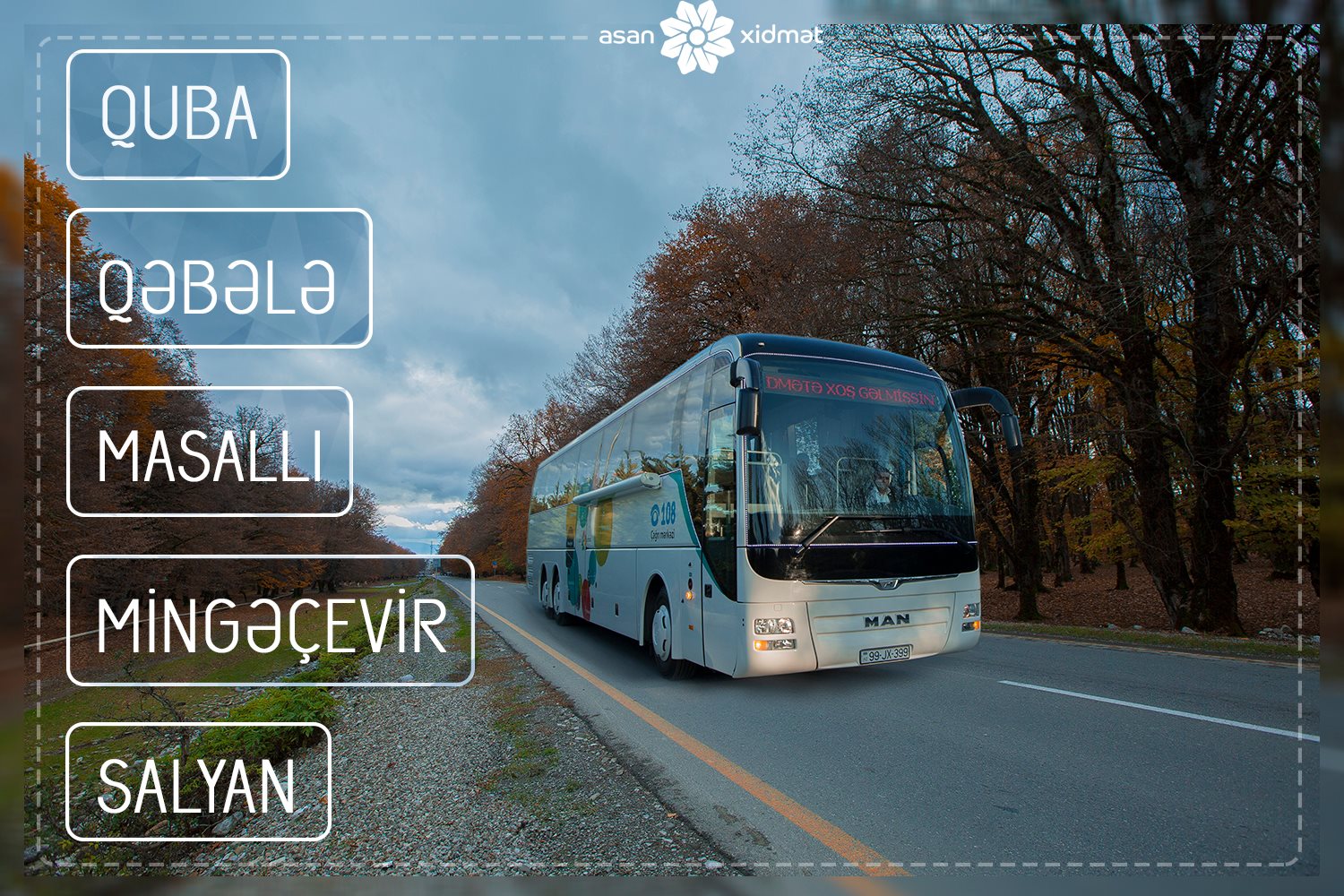 Səyyar ASAN xidmət 11 yanvar - 9 fevral tarixlərində Mingəçevir şəhərində Mingəçevir sakinlərinə, 11 - 27 yanvar tarixlərində isə Salyan rayonunda Şirvan və Salyan sakinlərinə səyyar formada xidmət göstərəcək.