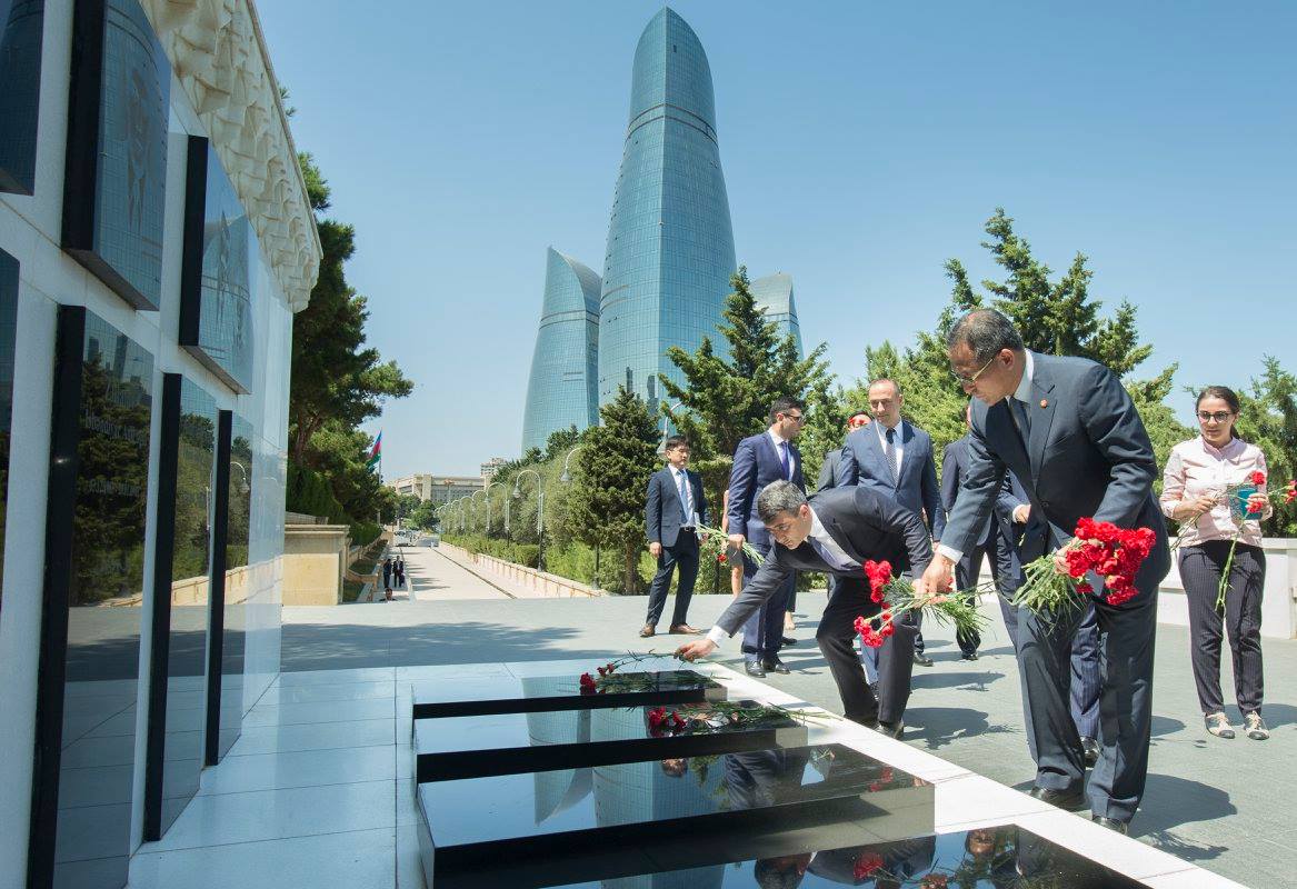Daha sonra Koreyanın daxili işlər naziri Şəhidlər Xiyabanını ziyarət edib. Qonaq Azərbaycanın müstəqilliyi və ərazi bütövlüyü uğrunda mübarizədə şəhid olan qəhrəman Vətən övladlarının xatirəsini yad edib, məzarları üzərinə güllər düzüb, “Əbədi məşəl” abidəsinin önünə əklil qoyub.
