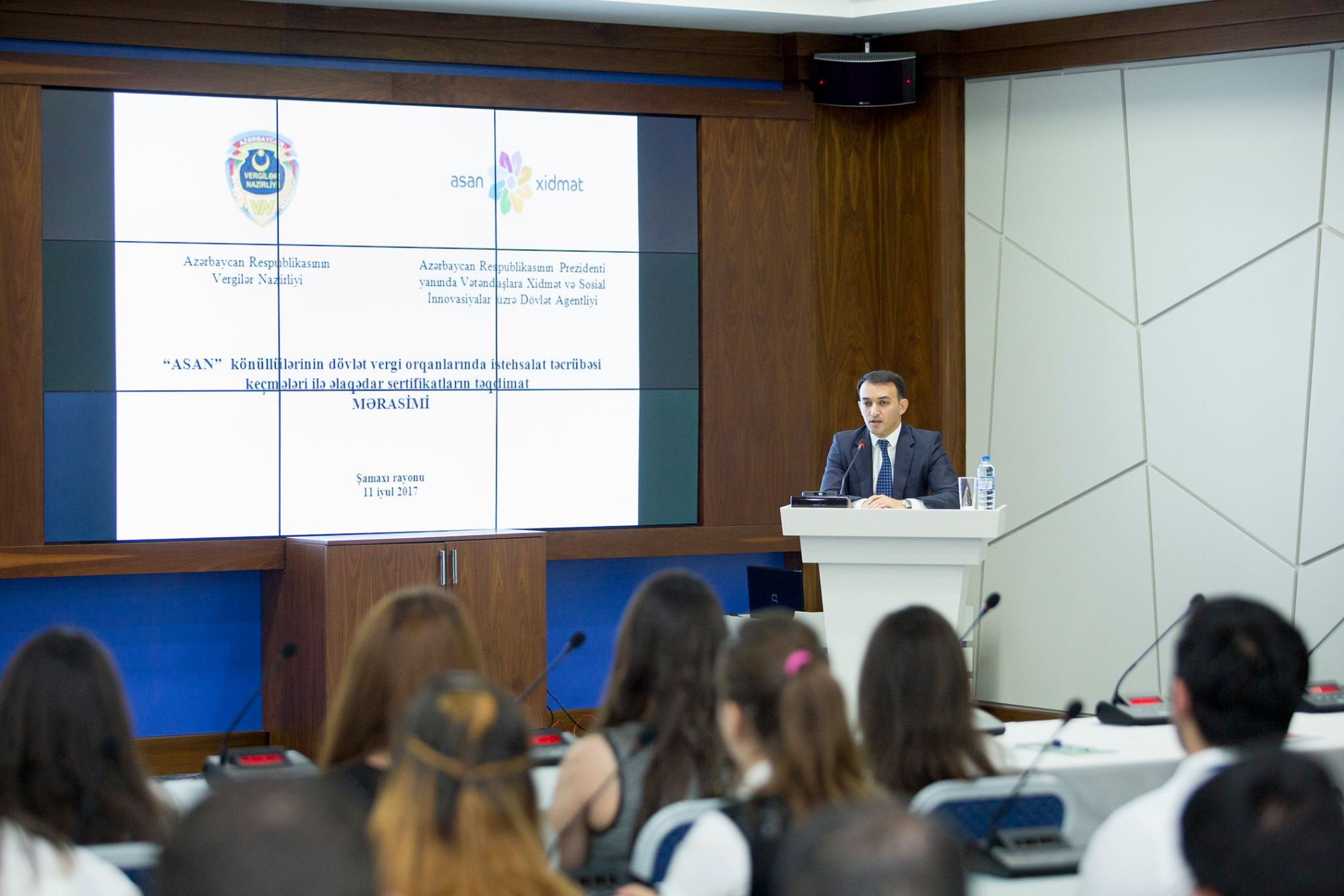 11 iyul 2017-ci il tarixində Vergilər Nazirliyinin Tədris Mərkəzində ASAN könüllülərinə sertifikatların təqdim edilməsi ilə bağlı tədbir keçirilib.